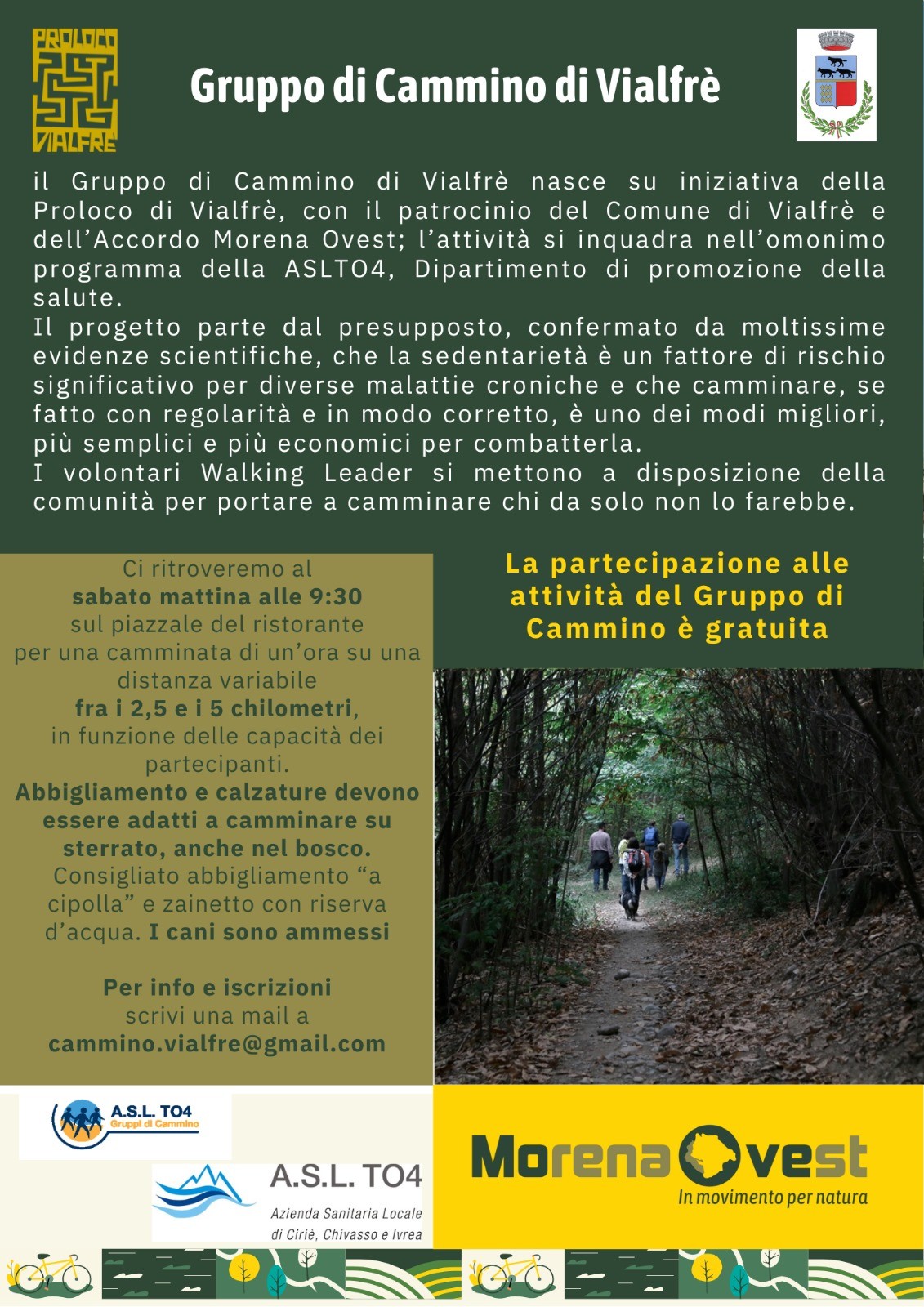 Il Gruppo di Cammino di Vialfrè nasce su iniziativa della pro Loco di Vialfrè, con il patrocinio del Comune e dell'Accordo Morena Ovest; l'attività si inquadra nel programma dell'ASLTO4.