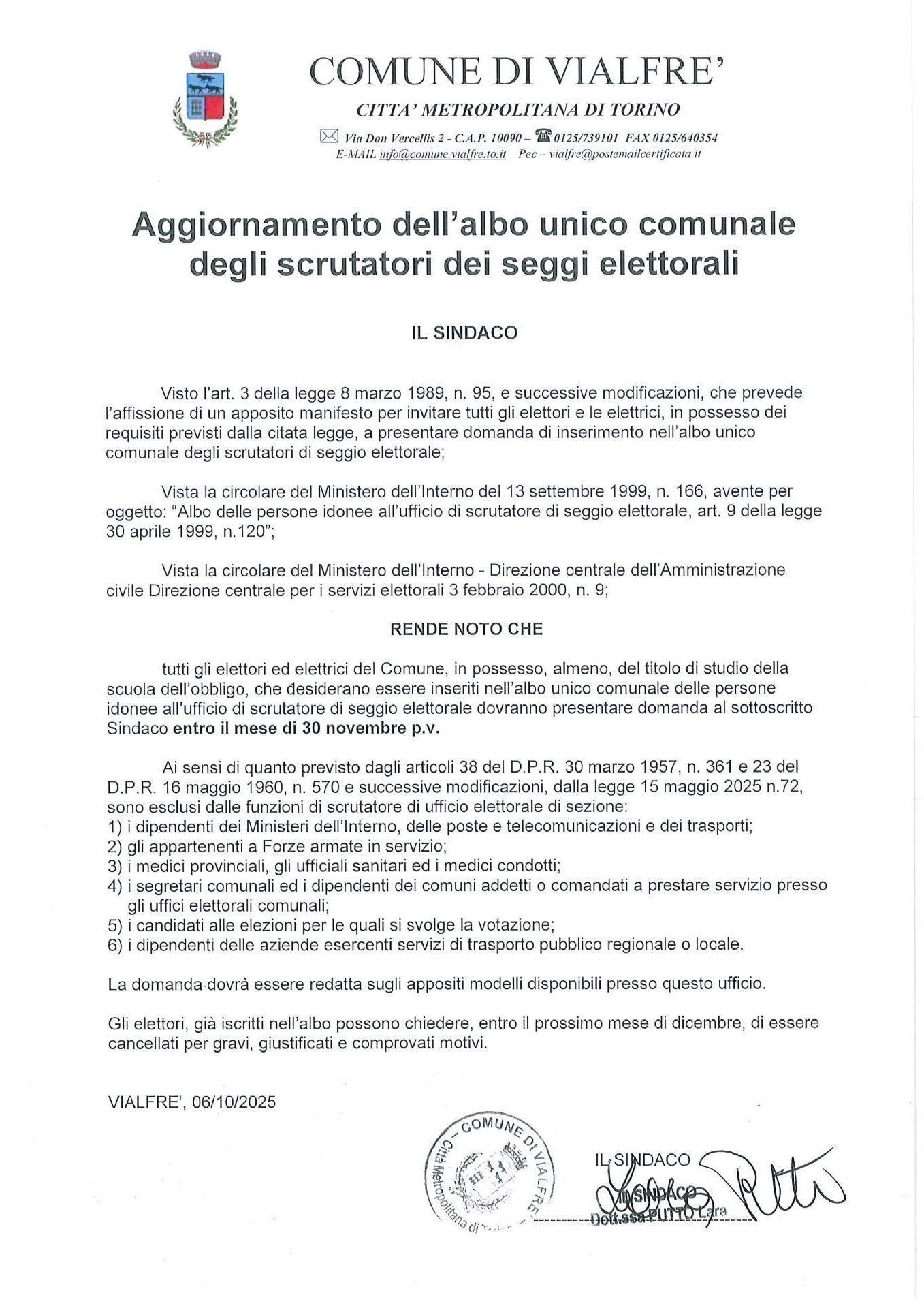 Tutti gli elettori ed elettrici del Comune che desiderano essere inseriti nell’albo unico comunale delle persone idonee all’ufficio di scrutatore di seggio elettorale dovranno presentare domanda al sottoscritto Sindaco entro il mese di novembre p.v.